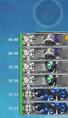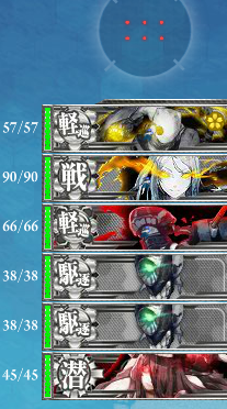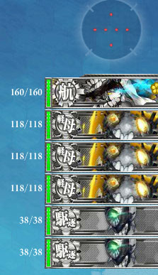 このマスは警戒陣を使って戦力を温存します。1~3番艦の雷撃ダメージは落ちないので阿武隈は旗艦にしておきます。砲撃は4~7番艦が砲撃命中率とダメージが出ます。あらかじめ編成で重巡を4番目と5番目にしておきます。