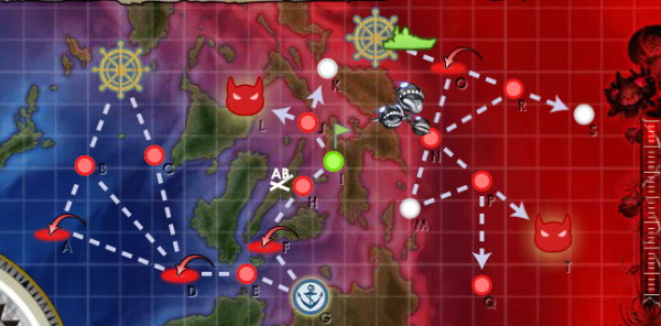P | 索敵値一定以上でボス 艦隊司令部で撤退している艦が多いと下に反れます |