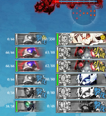 道中航空戦が多いので対空カットイン装備を1セット駆逐艦に装備させ、重巡には主砲2、偵察機、電探などで戦闘をまかせます。阿武隈には大発を2つと甲標的を装備