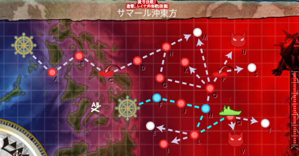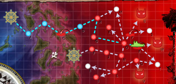 O | 上スタート、駆逐2以上かつ索敵一定以上でP、駆逐2未満でK 下スタート、索敵一定以上でK 第三ゲージ出現後は駆逐2以上でRマスへ |