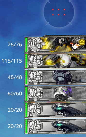 戦艦が使えない分火力不足になります。重巡を可能なだけ投入して雷巡を第二艦隊に1隻入れたほうがいいですね。この海域で重巡をかなり使ってしまうのでこのあとの海域が少し心配ですが仕方がない。