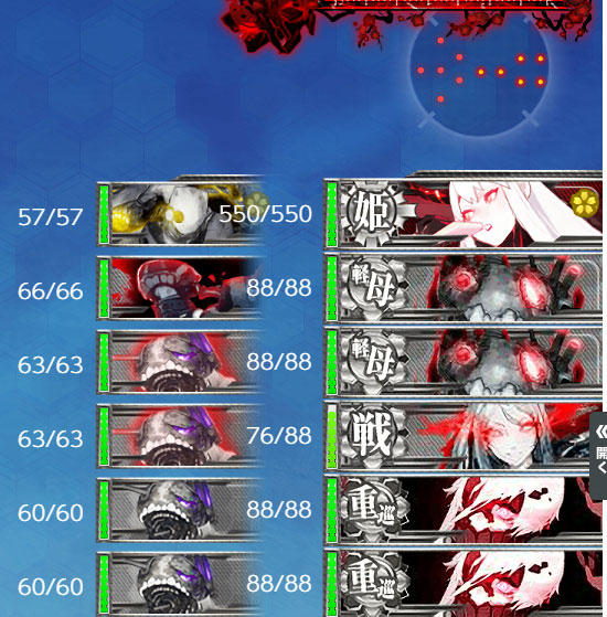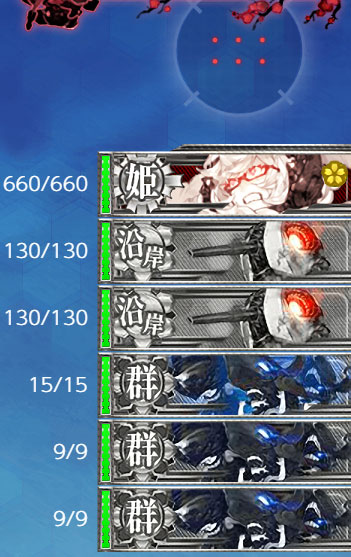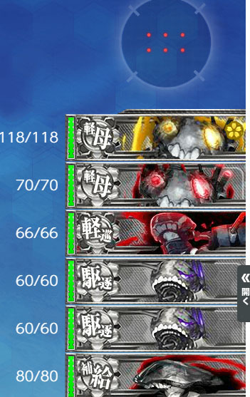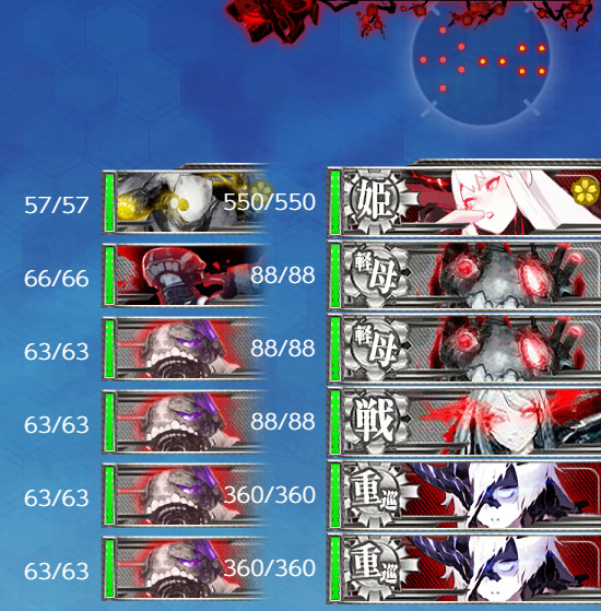 スタート | 通常艦隊でA 水上打撃部隊 (戦艦級+空母)6隻以上でC (戦艦級+正規空母)5隻以上でC 戦艦級5隻以上でC それ以外はB 空母機動部隊 (戦艦級+空母)6隻以上でC 空母系4隻以上でC 正規空母3隻以上でC それ以外はB 輸送護衛部隊 高速以上統一でB 航空戦艦を含むとC それ以外はB |