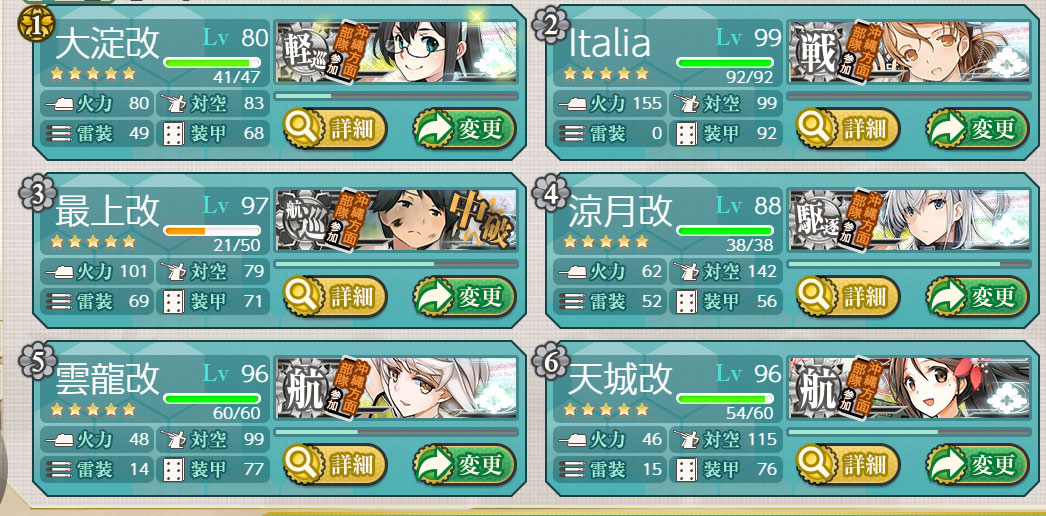 他5隻が通常艦。何隻か通常装備の艦を混ぜるとS勝利取りやすい