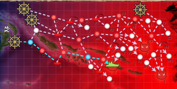 スタート | 通常艦隊は(下) 水上打撃部隊or輸送護衛部隊は(中央) 空母機動部隊は(上)新スタート地点追加後、空母機動部隊で新スタート地点 |
