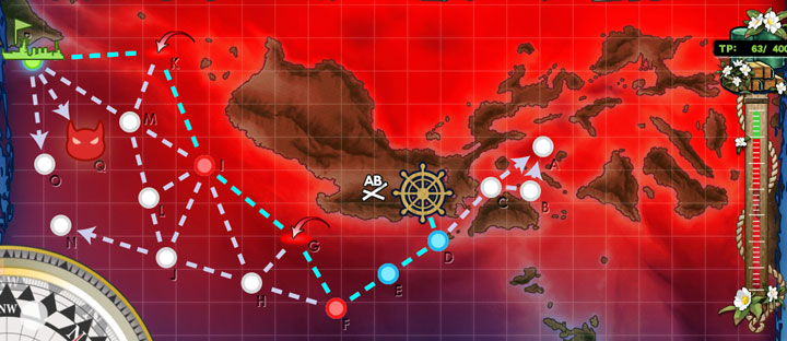 | I | 水上打撃部隊 または 空母機動部隊 でJ 輸送護衛部隊のとき ・(航戦+軽空母)2隻以上でL ・その他はK 通常艦隊のとき ・(駆逐+海防)6隻でK ・(駆逐+海防)5隻以上でM ・低速混成 かつ (戦艦級+空母系)3隻以上でJ ・(戦艦級+空母系)を含むとL ・その他はM |