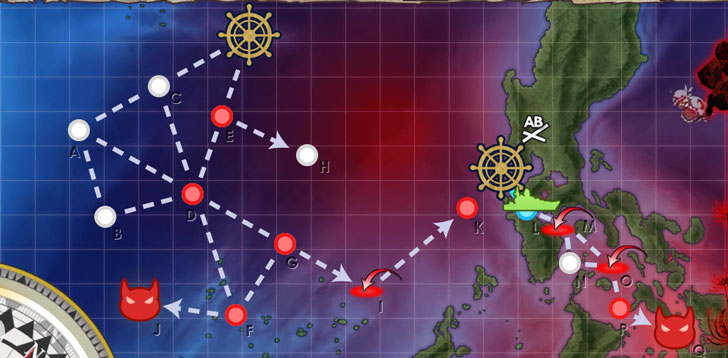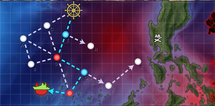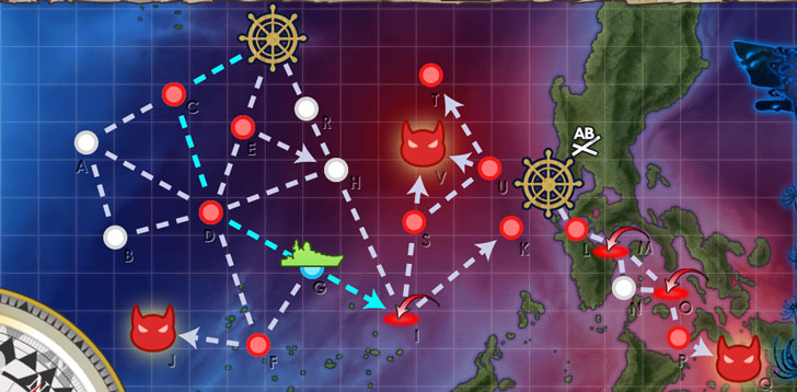 | スタート | 軽巡(1隻以下)、水母、補給、揚陸、駆逐、海防のみで編成すると右スタート可能 |