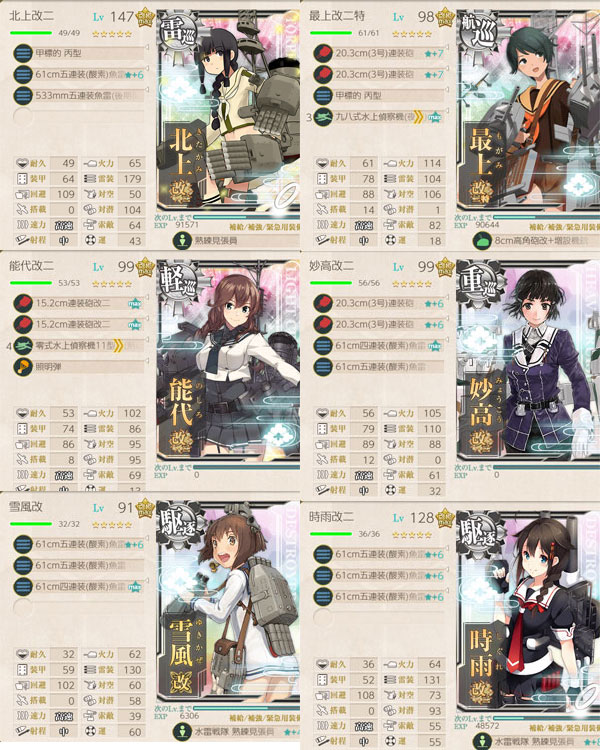| 愛宕, 高雄, 鳥海, 鈴谷, 筑摩, 最上, 摩耶, 能代, 島風, 藤波, 早波、Fletcher、陸奥(強特効) 妙高, 羽黒, 白露, 五月雨, 文月, 長波, 時雨(特効) 金剛、榛名, 隼鷹 Johnston, Fletcher, Atlanta, South Dakota, Washington | 「第二艦隊」 |