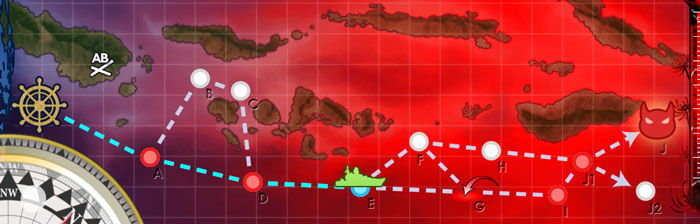 | Jマス(第一ボス) | 勝利A以上1回 | 通常艦隊第一艦隊 軽巡2航巡(重巡)1駆逐3 乙作戦は矢矧改二、最上改二、阿武隈改二の雷撃艦隊も可能 | 「第八艦隊」 |