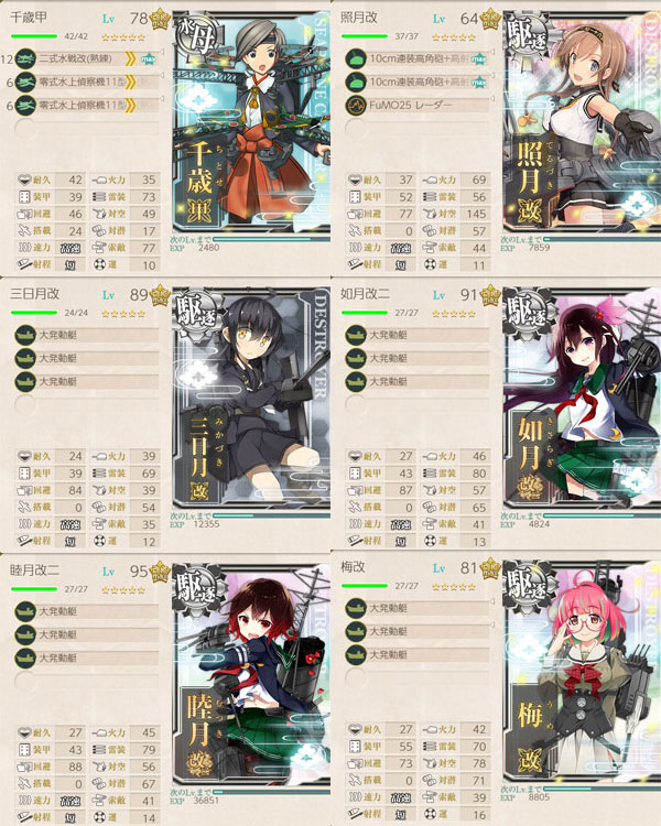 この先輸送ゲージがいくつあるかわからないため大発装備できる艦は少し温存して複数所持のサブ艦照月を使っています