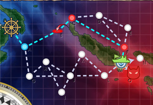 A | 戦闘無し 戦艦0+重巡系0+(駆逐+海防)0+水母0でB 戦艦0+重巡系0+(駆逐+海防)2以上+高速統一でB 戦艦0+重巡系0+軽巡1以上+水母1以上でB (駆逐+海防)2以下かつ低速でG (重巡系+水母)2以上でG |