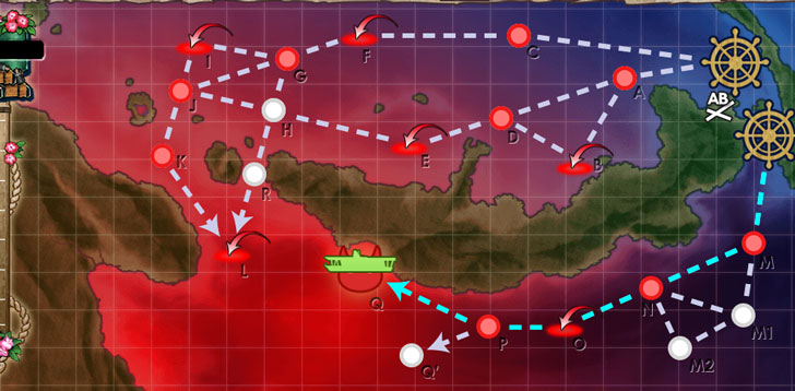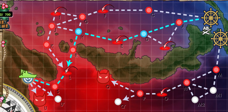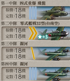出撃 | 3-2クリア前 通常艦隊、遊撃艦隊は1スタート(上)方面護衛隊 連合艦隊はスタート2(右)機動部隊 3-2クリア後 通常艦隊、遊撃艦隊で1スタート(上)方面護衛隊 空母機動部隊はスタート2(右)3-2ボスへ 機動部隊 水上打撃部隊はスタート3(真ん中)方面護衛隊 |