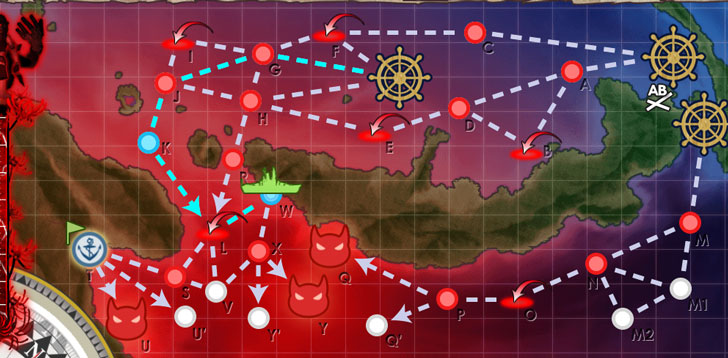 L | 通常・遊撃部隊はS 3スタート以降の場合 水上打撃部隊+(戦艦+空母系)4以下+軽巡1以上+(速吸改、神威改母、山汐丸改、宗谷)1以上or(明石改、秋津洲改)1以上でW (正空+装空)1以上でS |