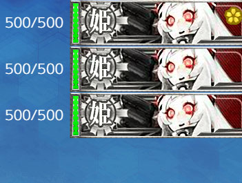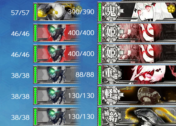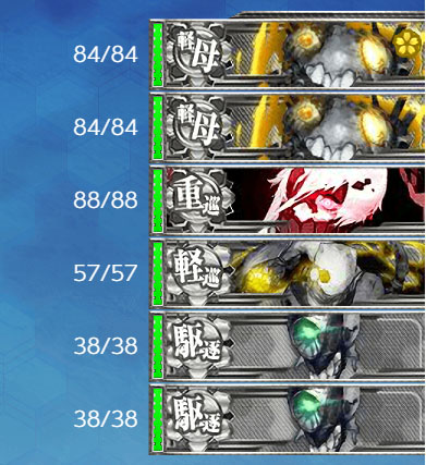 3(中央スタート) | ・低速艦隊 (正空+装空)1でF 軽巡1でF 輸送護衛部隊はH 水上打撃部隊はG ・高速艦隊 (正空+装空)1でG 軽空2以上でG 戦艦級2以上でG 軽巡1でG それ以外はH |