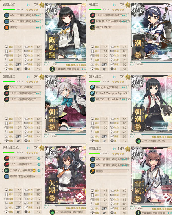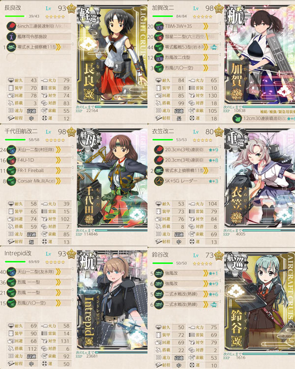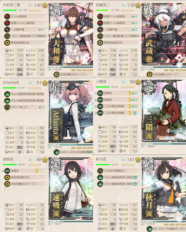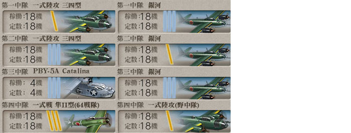 甲作戦 | 補強増設x1、給糧艦「間宮」x3、給糧艦「伊良湖」x3、勲章x1、新型航空兵装資材x2、流星改(熟練)★+2、紫電改(三四三空) 戦闘701★+2、15m二重測距儀改+21号電探改二+熟練射撃指揮所 |