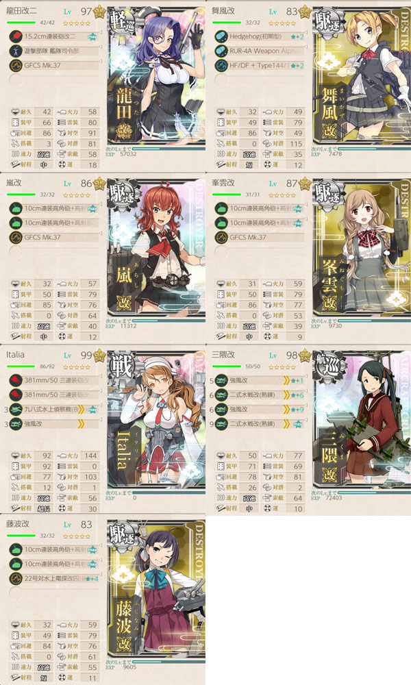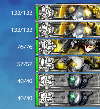 I(泊地) | 低速艦隊はJ (正空+装空)1以上でJ (戦艦級+軽空)3以上でJ 重巡級3以上でJ (駆逐+海防)4以下でJ (正空+装空)0+(戦艦級+軽空)2以下+重巡級2以下+(駆逐+海防)5以上+高速統一はX |