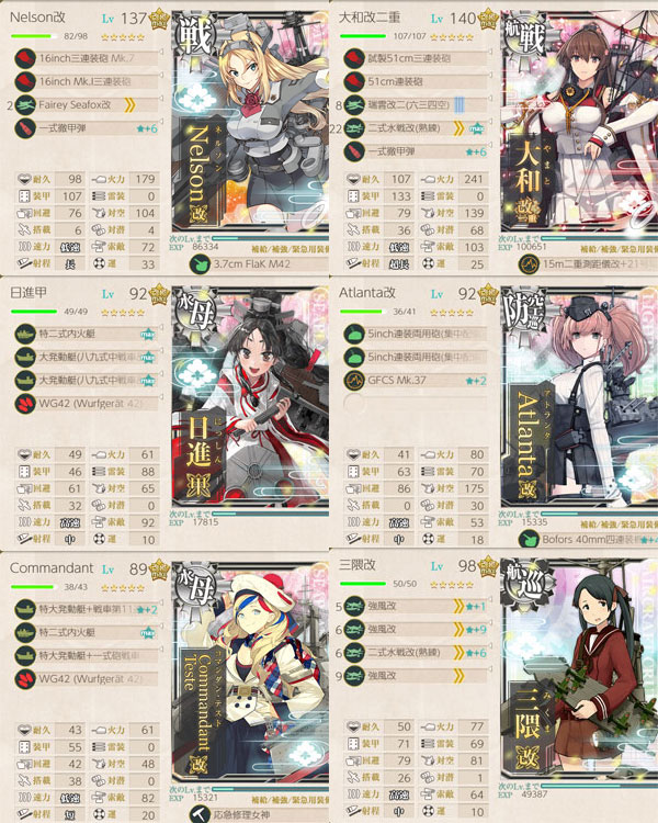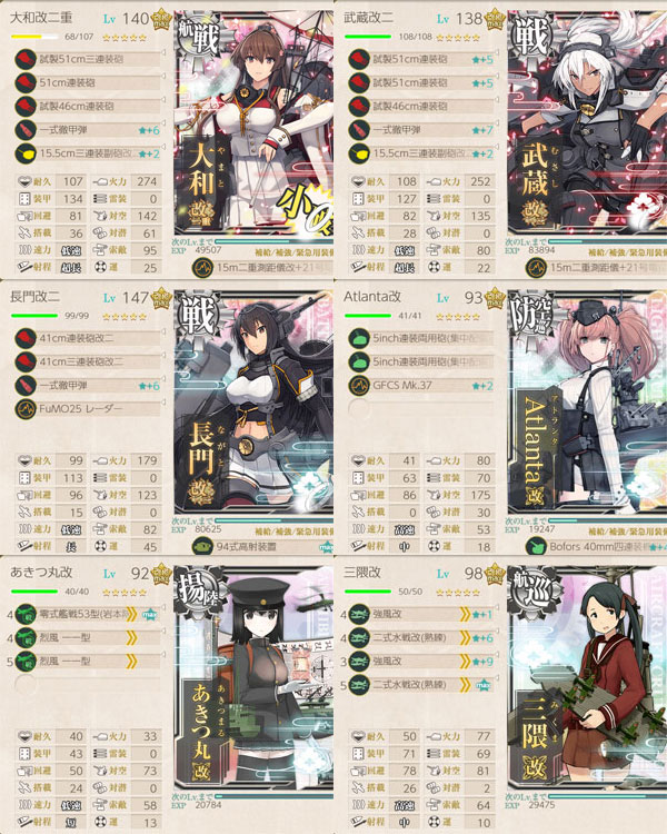 甲作戦 | Maryland、勲章x3、改修資材x10、戦闘詳報x1、5inch連装砲(副砲配置) 集中配備★+2、SG レーダー(後期型)★+2、試製51cm三連装砲、甲種勲章 |