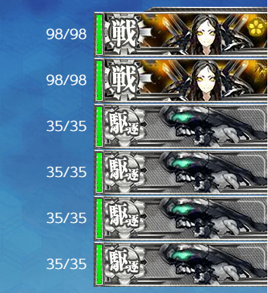道中警戒陣だと受けに回って大破することが多かったので単縦陣でいきました。ボスは梯形陣