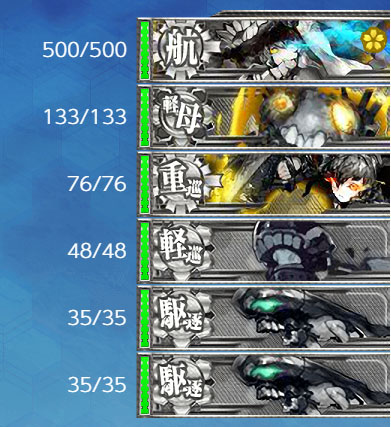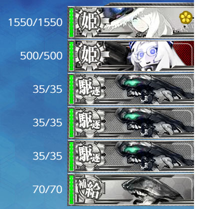 甲作戦 | 給糧艦「伊良湖」x2、給糧艦「間宮」x2、応急修理女神x2、補強増設、熟練甲板要員x2、「改修資材x5 or明石から選択」、勲章、Loire 130M(夜偵) |