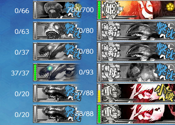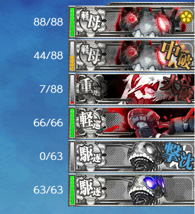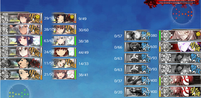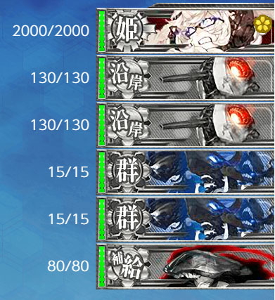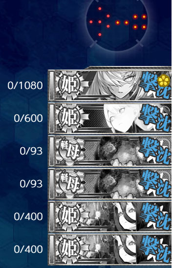 乙作戦でも最終形態のボスの制空値が異常に高い、制空権を取るためには空母2隻+航巡2隻をすべて戦闘機+水戦をガン済みしてやっと航空優勢、基地航空隊は陸攻3+局戦1、行動半径5の陸攻を使用した。制空権を取れば大和型が着弾観測でかなり随伴を減らしてくれる。制空値が足りない場合は局戦を増やす