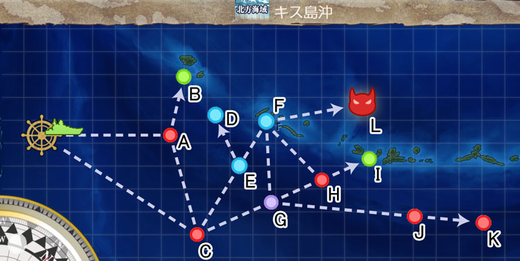 G | F | 潜水艦を含むとJ 正規空母を含むとJ (戦艦級+軽空母)2隻でJ 速力:低速 が含まれているとH 電探を装備した艦が0隻でH (軽巡+駆逐+補給)5隻以下でH 高速+以上統一でF 補給艦を含むとFマス Hマスのランダム それ以外はFマス Hマスのランダム |